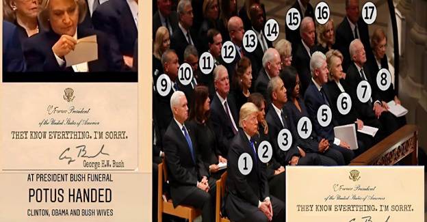 What happened at the funeral was very supportive of this “agenda.” For all of the world to see, mysterious envelopes were given to “swamp members.” They opened them at the precise moment that the camera was filming President Bushes coffin passing, and they all looked distraught. Shocked, as if the “gig” was finally up. The letters must have contained something of a “got-ya”, right?